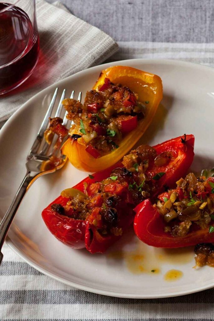 A vibrant tapas-style appetizer of roasted bell peppers stuffed with raisins, olives, and anchovies.