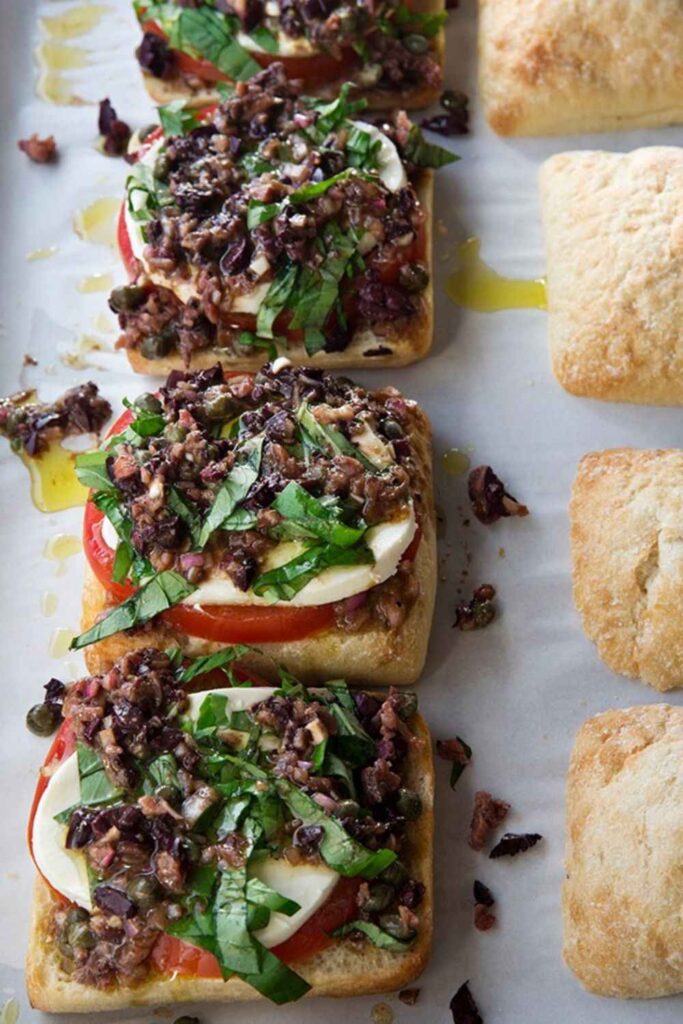- Assemble Sandwiches: Place ciabatta bottoms cut side up on a sheet pan. Add tomato slices, spoon ⅔ of the vinaigrette over them, layer mozzarella, and sprinkle with basil.